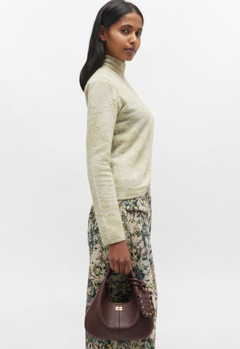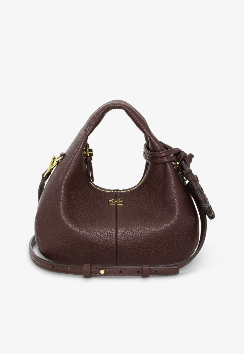 This bag features a top handle, adjustable and removable strap and a zipper closing. The bag has a mirror hangtag and an internal pocket.