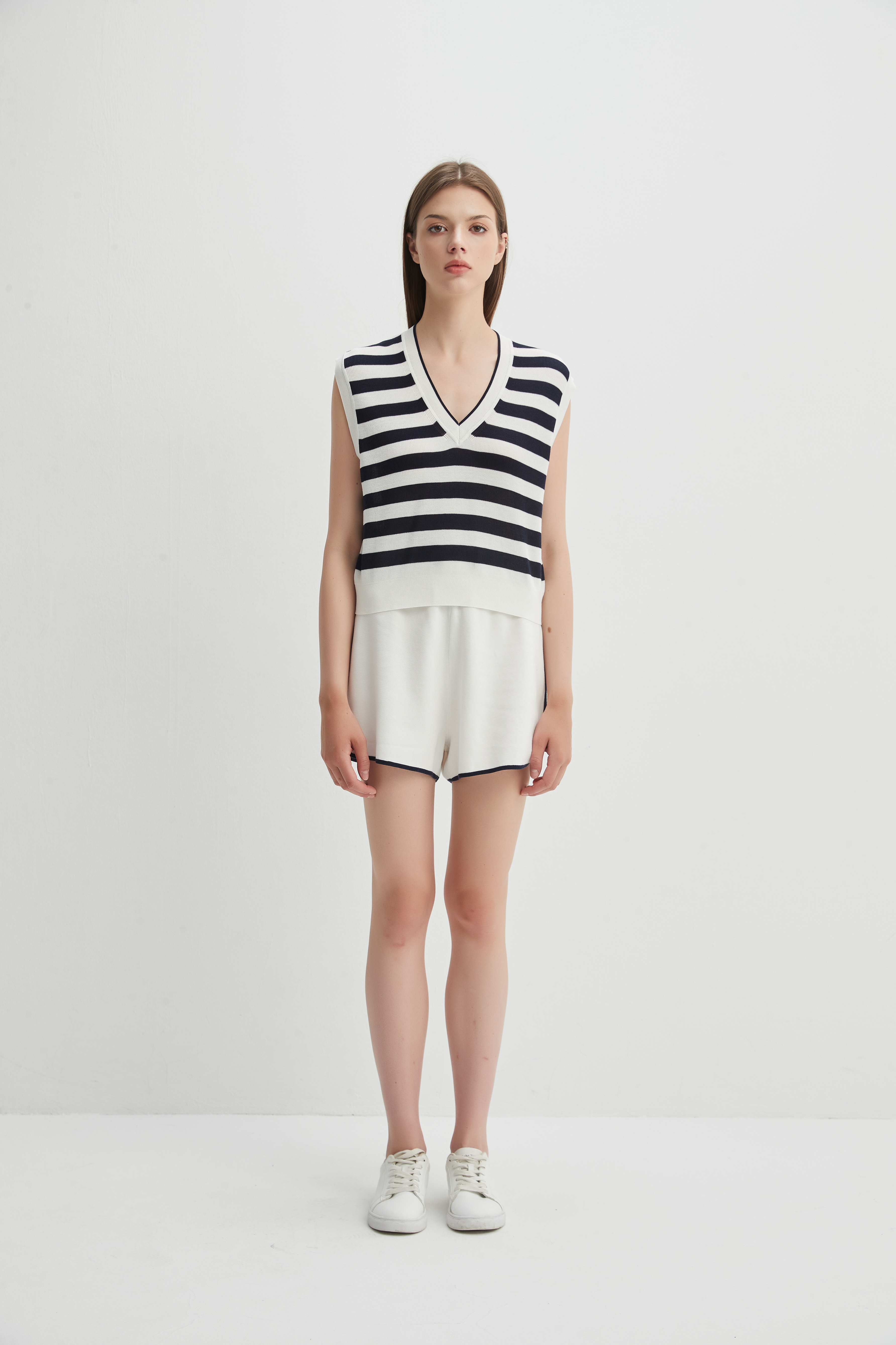 A sleeveless knit V-neck vest with a black and white striped pattern and a solid white hem, offering a chic, nautical-inspired look.