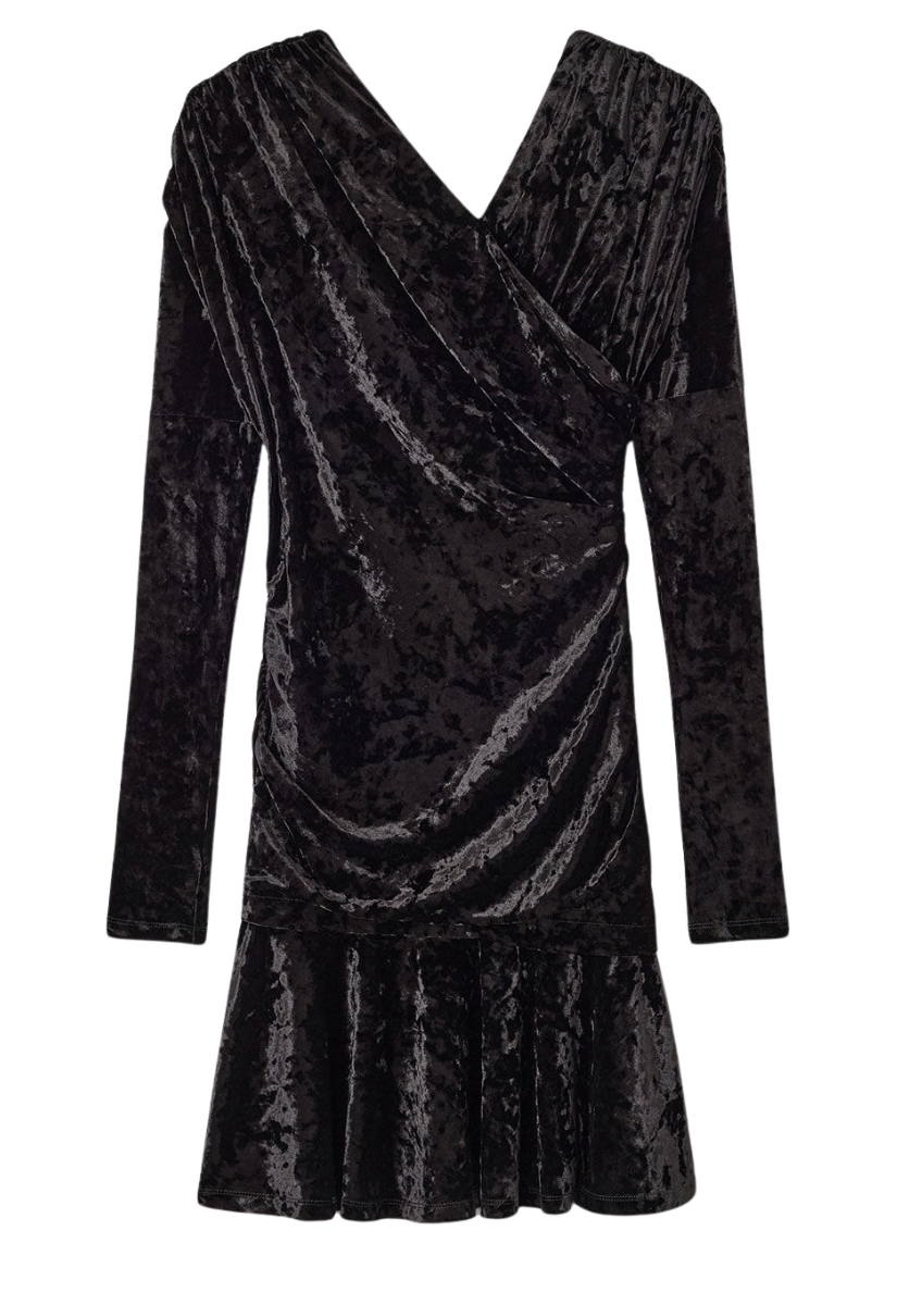 This dress features an asymmetrical neckline, long sleeves and draped ruching along the bodice.
